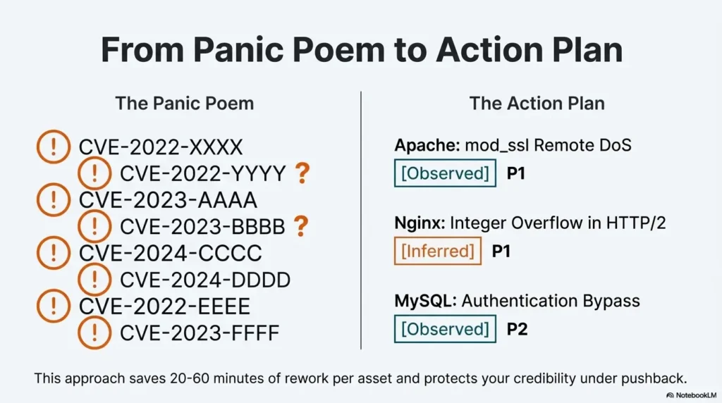 This doesn’t mean you skip the finding. It means you write it with clarity: “Present version suggests exposure; config evidence reduces likelihood.” That single line can turn a debate into a decision.