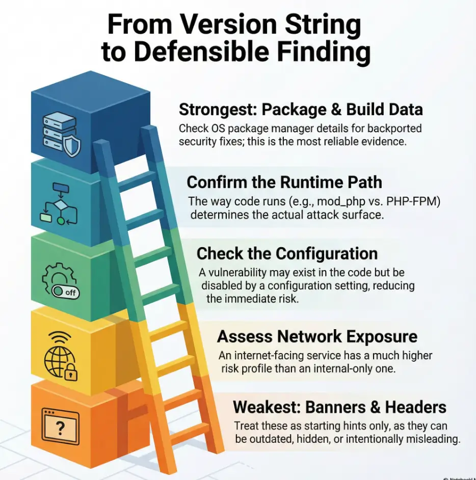Most risk arguments collapse around “where did you get that version?” and “does that version reflect the patched code path?” The evidence ladder frames version strings as hints, not proof, and pushes you toward package metadata, build flags, runtime modules, and OS advisories.