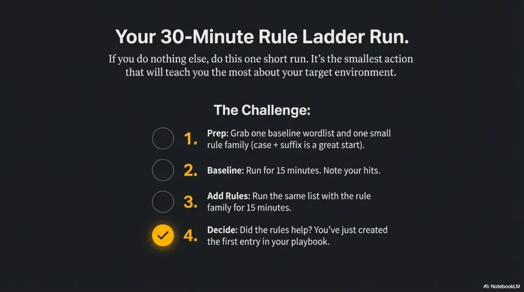 Remember the open question from the start—what’s the smallest change that unlocks the biggest jump? For most real environments, it’s not a mythical mega-wordlist. It’s a measured first rule family—often simple casing and suffix behavior—tested quickly, kept only if it earns results, and constrained so it doesn’t explode.