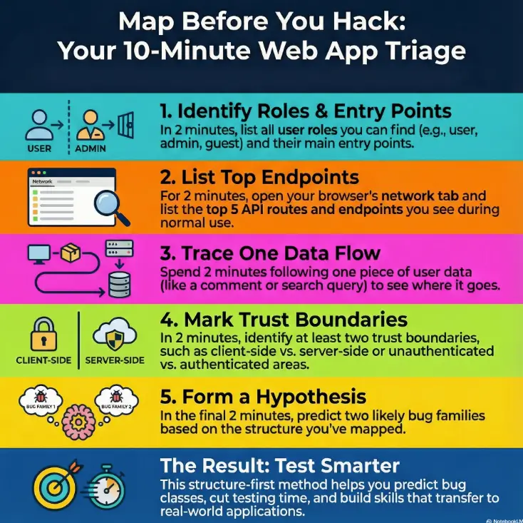 Start with a 10-minute structural map: roles, top endpoints seen in traffic, one data flow, and two trust boundaries. This makes your next tests deliberate instead of random. Apply in 60 seconds: Write down the top three roles you suspect before you log in.